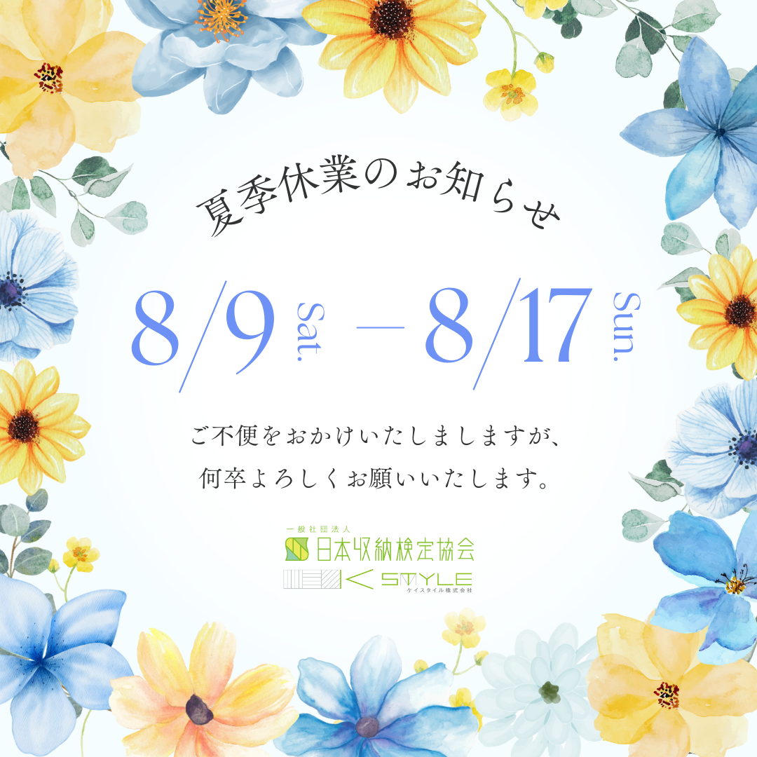 いつも一般社団法人日本収納検定協会をご愛顧いただきありがとうございます。 誠に勝手ながら下記の期間を夏季休業とさせていただきます。 皆様にはご不便をお掛けしますが、何卒ご了承いただきますようお願い致します。 […]